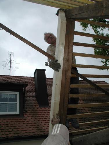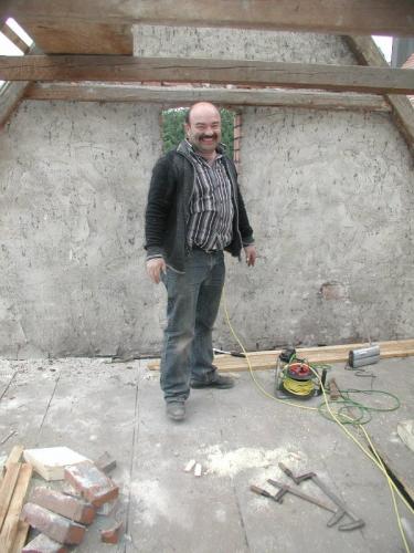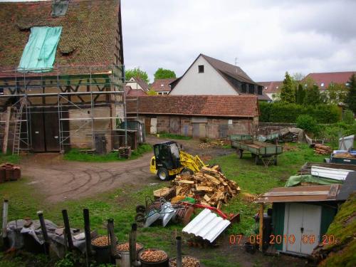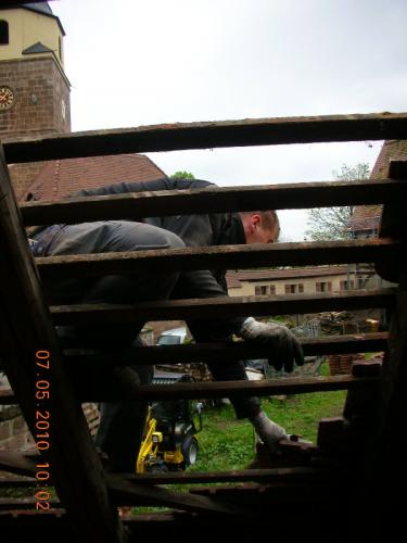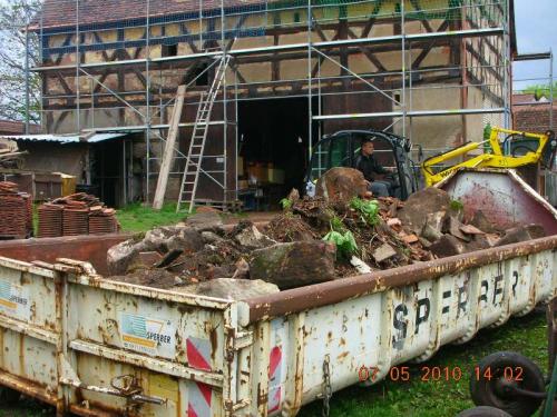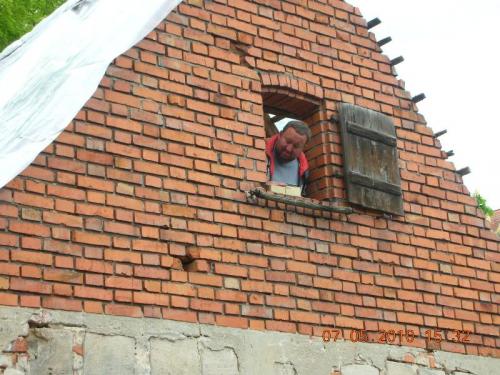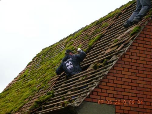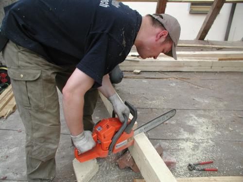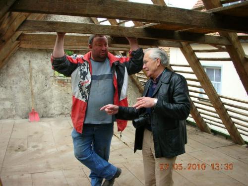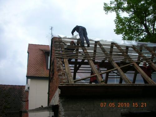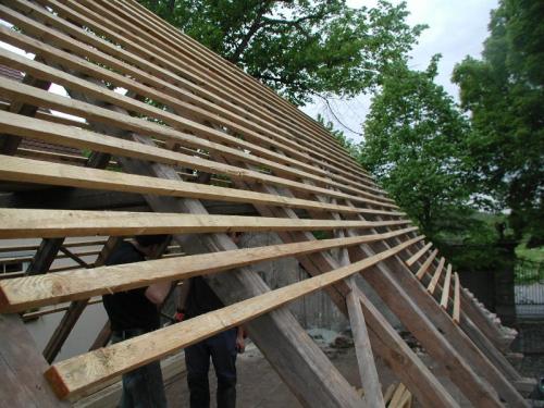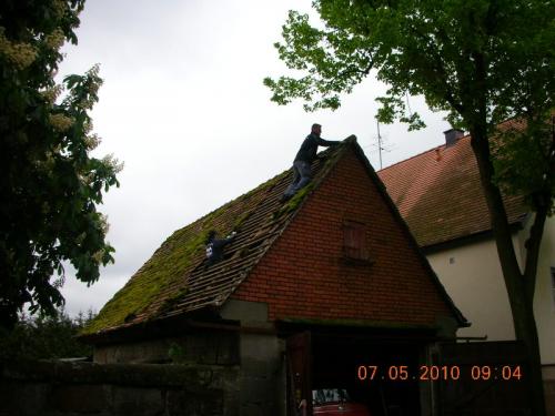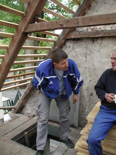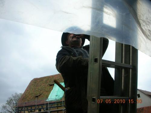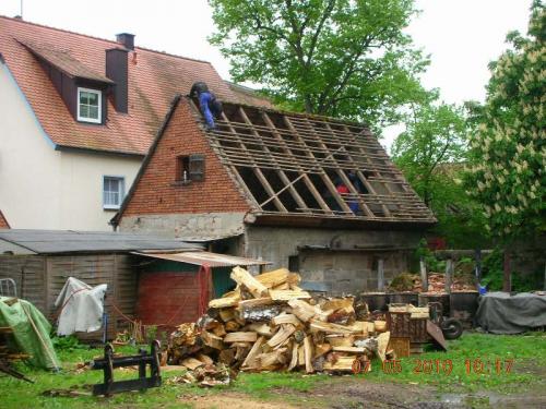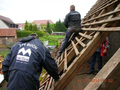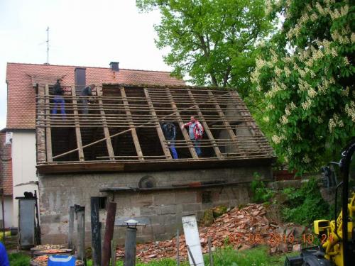 Für das erste Wochenende war geplant, mal Ordnung ums Gebäude zu schaffen und wenn möglich das Dach abzudecken. Viele fleißige Hände, haben das ganze beschleunigt, so dass am Freitag das Dach schon komplett abgedeckt war. Am Samstag wurden die alten Dachlatten entfernt und die neuen gleich aufgenagelt. Auch da wirbelten wieder viele fleißige Hände über das Gebäude.