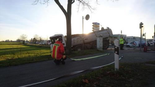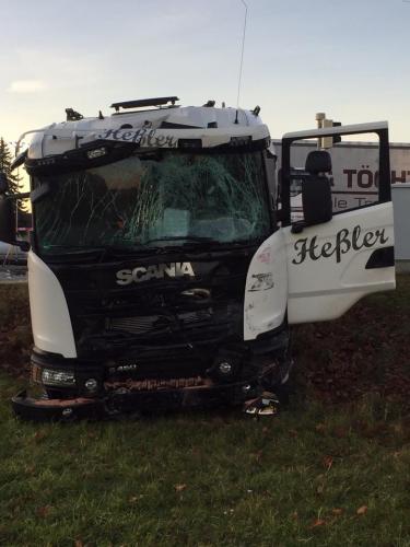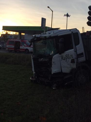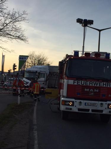 Heute Nachmittag wurden wir zu einem Verkehrsunfall mit 2 LKW alarmiert. Bei unserem Eintreffen fanden wir zwei stark beschädigte LKW, teilweise im Kreuzungsbereich stehend vor. Beide Fahrer konnten sich verletzt aber aus eigener Kraft aus den Führerhäusern befreien und wurden von Ersthelfern betreut. Wir übernahmen die Erstversorgung der Verletzten, sicherten die Unfallstelle ab, stellten den Brandschutz sicher und leuchteten die Unfallstelle gemeinsam mit der Berufsfeuerwehr aus um die sichere Bergung der Unfallfahrzeuge durch zwei Bergungsunternehmen zu gewährleisten. Nachdem wir in Zusammenarbeit mit der Berufsfeuerwehr mit Öl verunreinigtes Erdreich abgetragen und die Straße grob gesäubert hatten rückten wir nach ca. 4 Stunden wieder ein.