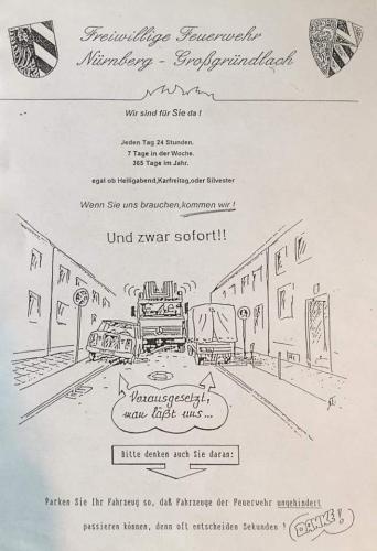 Ihr habt heute morgen diesen Zettel an eurem PKW vorgefunden? Dann habt ihr euer Fahrzeug leider etwas ungünstig geparkt. Während der gestrigen Übung zum Thema „Straßenkunde“ sind wir quer durch Großgründlach gefahren. Überall dort, wo wir aufgrund geparkter Autos nicht oder nur mit großen Problemen durchkamen, haben wir diese Info verteilt. Unsere Bitte: Achtet ein bisschen mehr darauf, dass unsere LKWs im Zweifelsfall auch bis zu eurem Grundstück durchkommen müssen!
